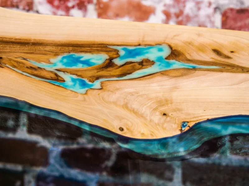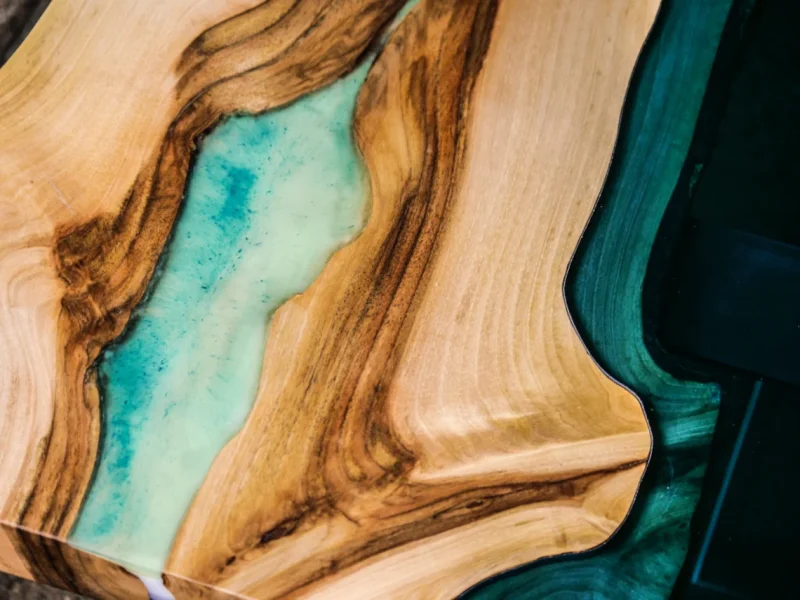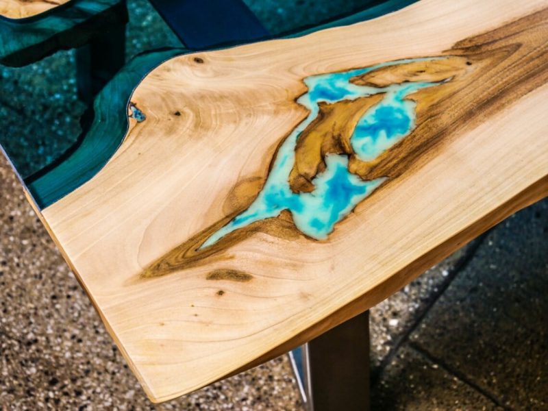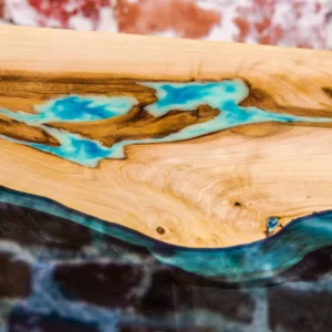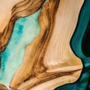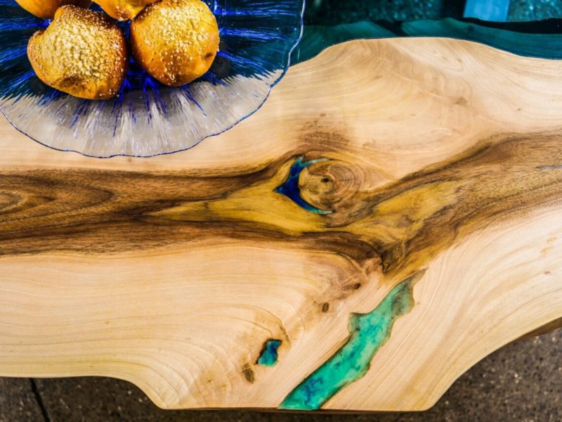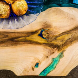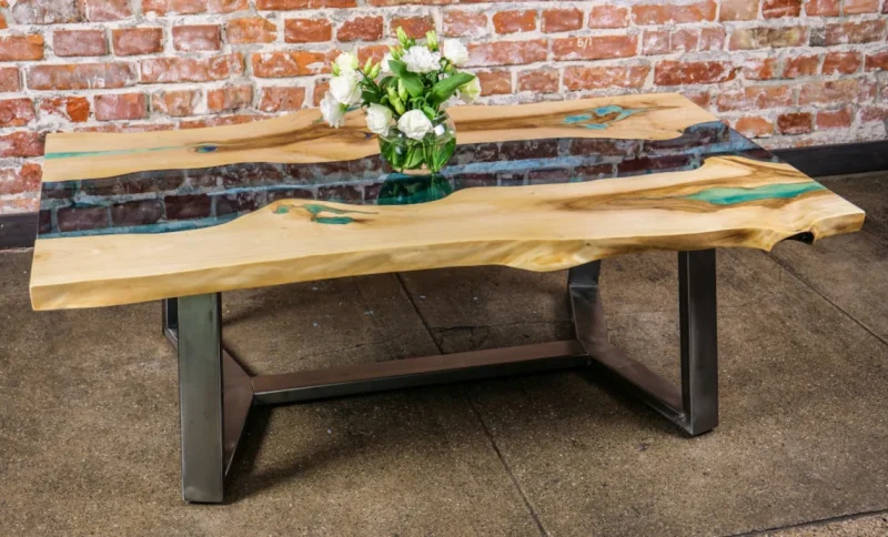 Turkusowy stolik kawowy z drewna orzecha włoskiego