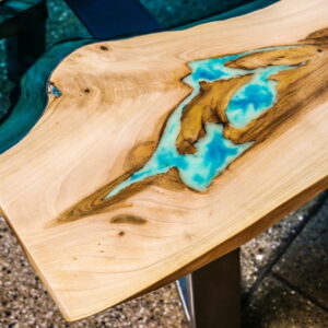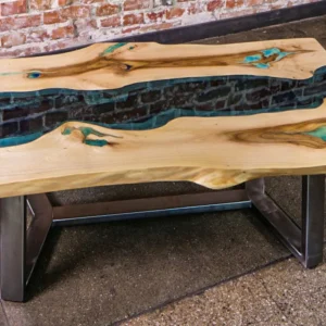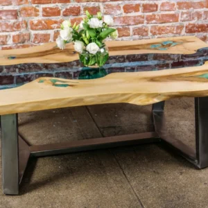 Uroczy stolik kawowy o naturalnej krawędzi ze szklaną rzeką i świecącą w ciemności żywicą. Stolik na metalowych nogach ze stali szczotkowanej. Niebieska szklana “rzeka” przepływa pomiędzy dwoma kawałkami drewna orzechowego. Ten mebel doda stylu i elegancji Twoim wnętrzom.
