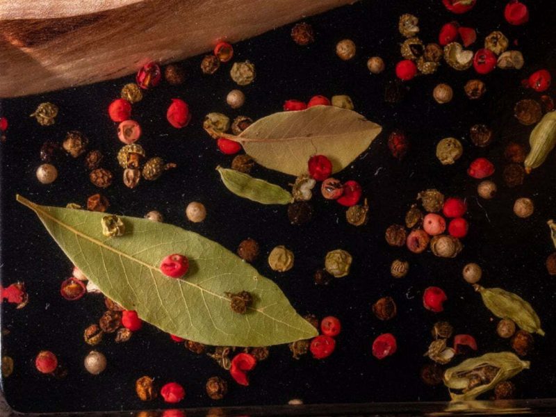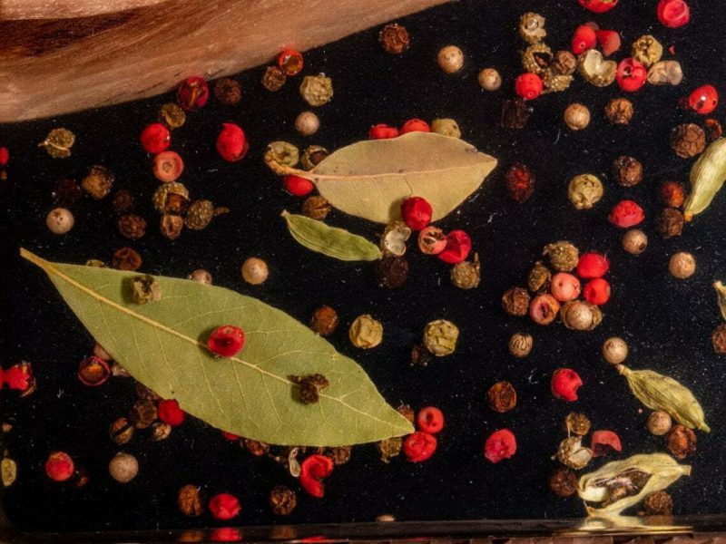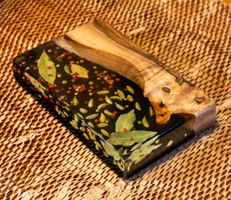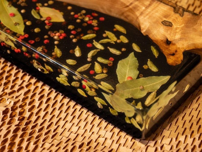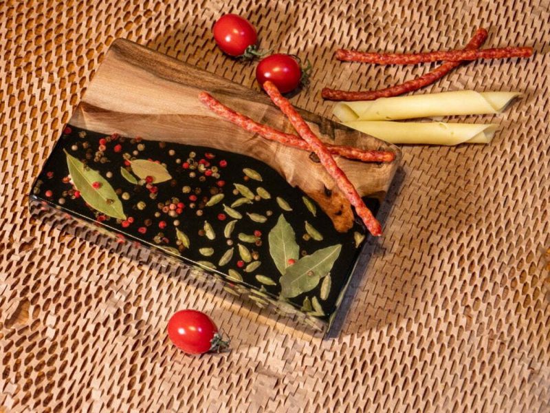 Niezwykła drewniana deska do serwowania / deska do serów z czerwonym pieprzem, czarnym pieprzem, kardamonem i liściem laurowym – a to wszystko zalane żywicą epoksydową – nada Twojemu spotkaniu rodzinnemu nowy, świeży klimat!