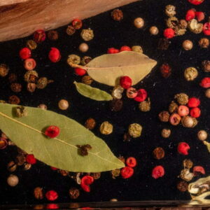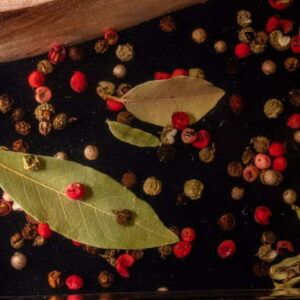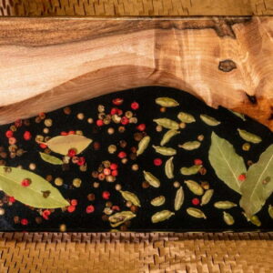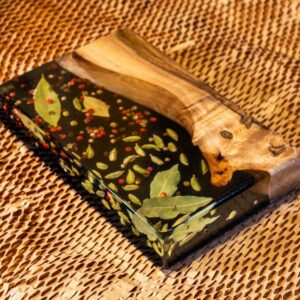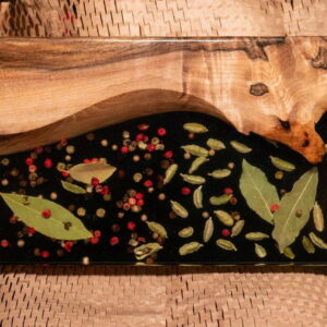 Niezwykła drewniana deska do serwowania / deska do serów z czerwonym pieprzem, czarnym pieprzem, kardamonem i liściem laurowym – a to wszystko zalane żywicą epoksydową – nada Twojemu spotkaniu rodzinnemu nowy, świeży klimat!