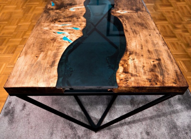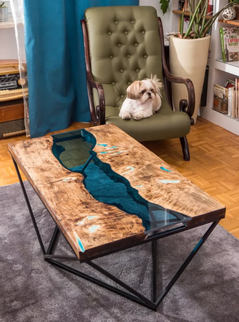 Urzekający nowoczesny szklany stolik kawowy ze szklaną rzeką i subtelnymi czarnymi nogami w stylu industrialnym. Półprzezroczyste grube niebieskie szkło cięte na naturalny kształt drewna sprawia wrażenie płynącej rzeki. Naturalne pęknięcia, sęki i otwory wypełnione zostały żywicą z domieszką turkusowego luminescencyjnego proszku. Mieszanka ta świeci przez kilka godzin.