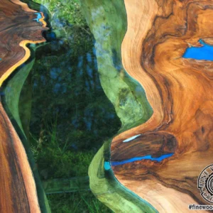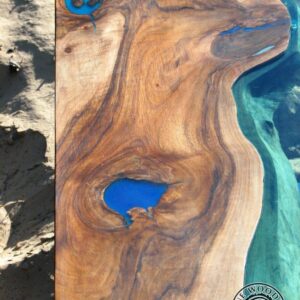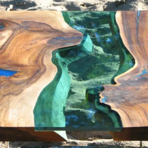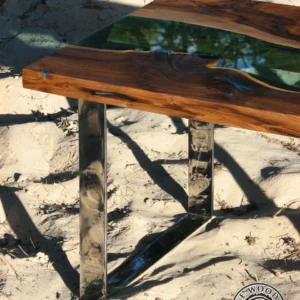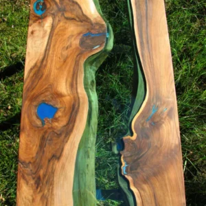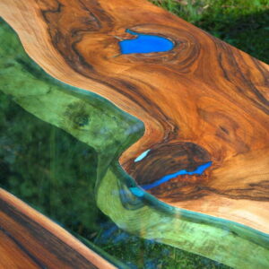 Kolejna wersja nowoczesnego stolika kawowego z rzeką z zielonego szkła i srebrnymi, błyszczącymi nogami tzw. efekt lustra. Inspiracją do stworzenia tego stolika była jaskinia Blue Hole w Morzu Karaibskim – dwa unikalne i naturalne wgłębienia w kawałkach drewna orzechowego zostały wypełnione błękitną żywicą dając wrażenie naturalnej dziury w morzu. Tafla zielonego szkła pomiędzy kawałkami drewna jest niczym płynąca rzeka. Mebel doda stylu i elegancji Twoim wnętrzom.