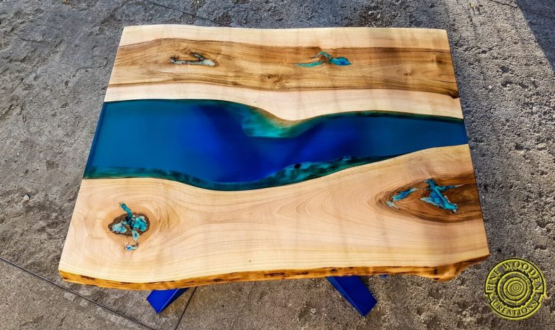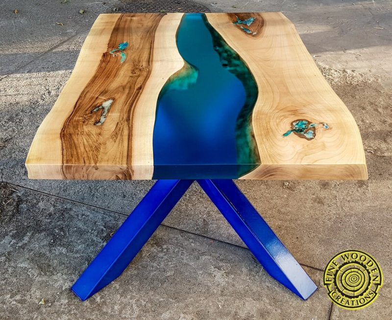 Uroczy i niepowtarzalny stolik kawowy na metalowych nogach w kolorze turkusu. Pomiędzy dwoma kawałkami drewna z orzecha włoskiego płynie półprzezroczysta turkusowa rzeka z żywicy epoksydowej. Wszystkie pęknięcia, słoje i otwory w drewnie również zalane są żywicą. Mebel ten doda stylu i elegancji Twoim wnętrzom.