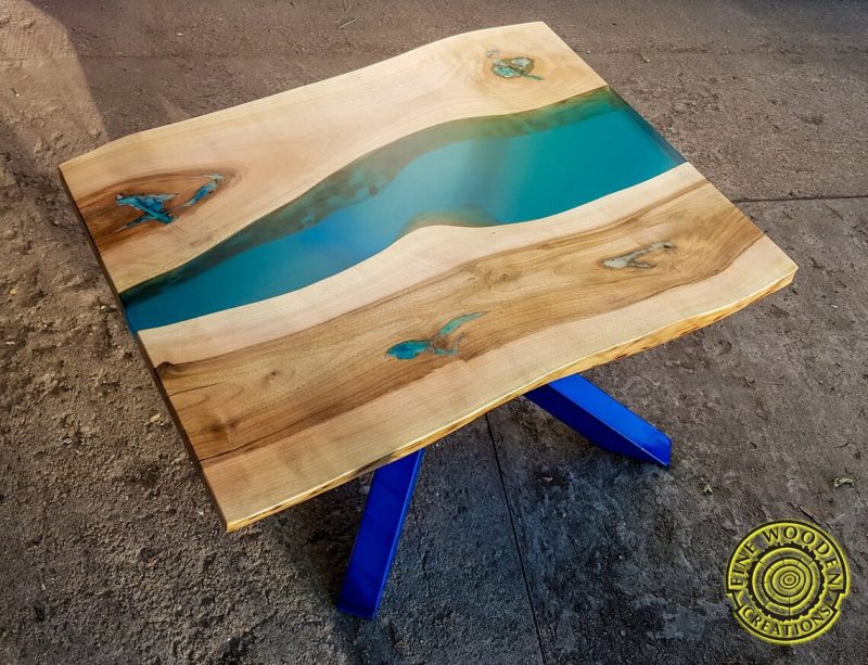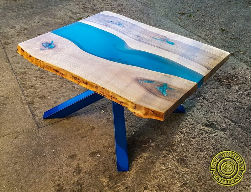 -Blat stołu wykonany z orzecha włoskiego; grubość żywicy i drewna wynosi 4,5 cm,