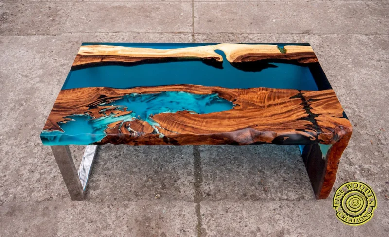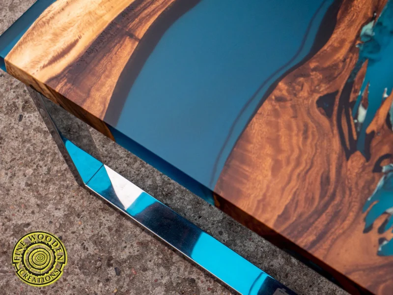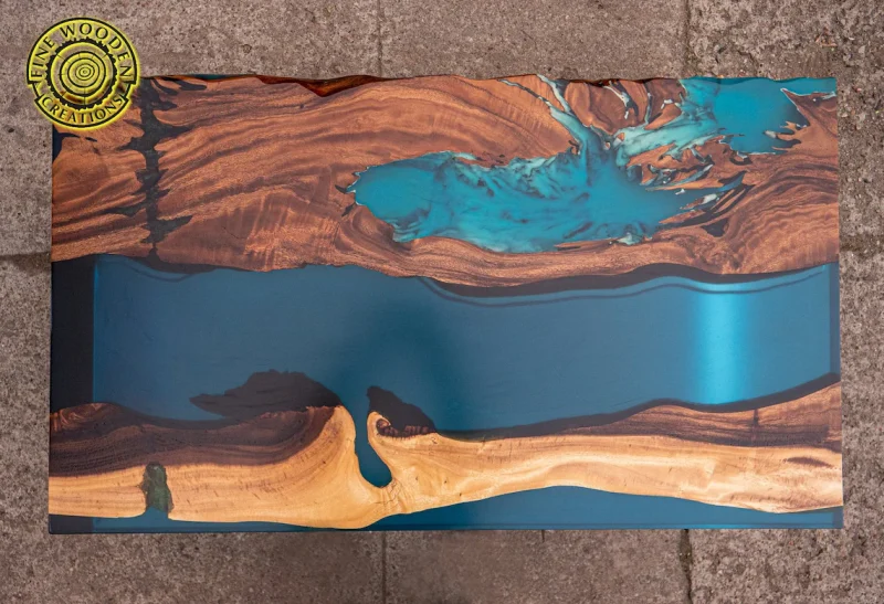 ‘Blue resin river’ Elegancki stolik kawowy z orzecha