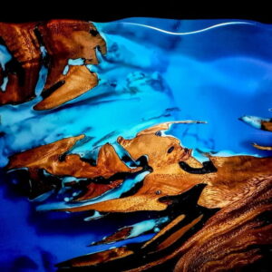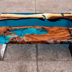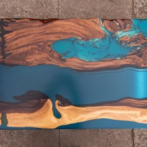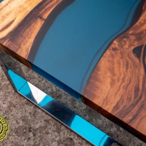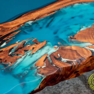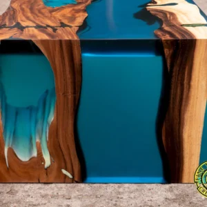 W meblu z egzotycznego drewna suar zastosowano specjalną mieszankę żywicy epoksydowej z turkusowym proszkiem luminescencyjnym, które wypełniają pęknięcia, słoje i otwory w drewnie. Mieszanka ta świeci w ciemności subtelną turkusową barwą przez kilka godzin. Fantastyczny mebel, który sprawi, że Twoje wnętrze będzie niepowtarzalne i zachwycające.