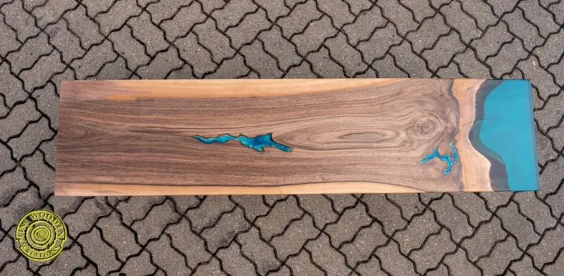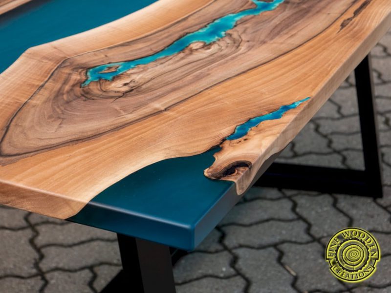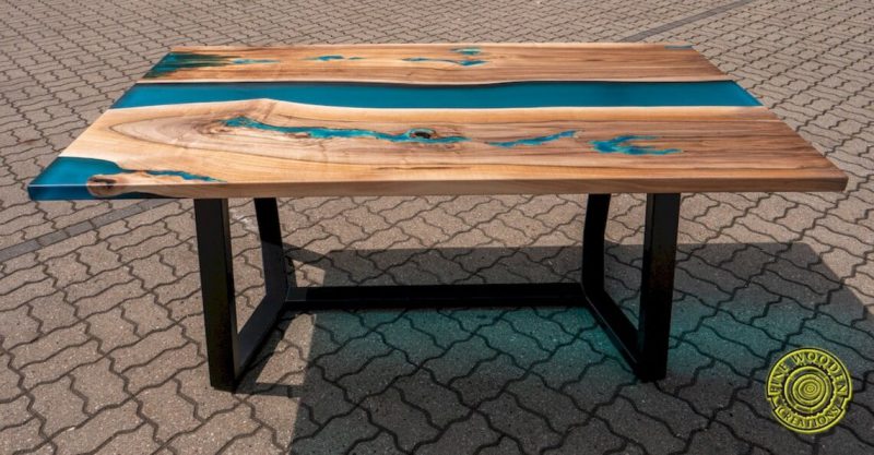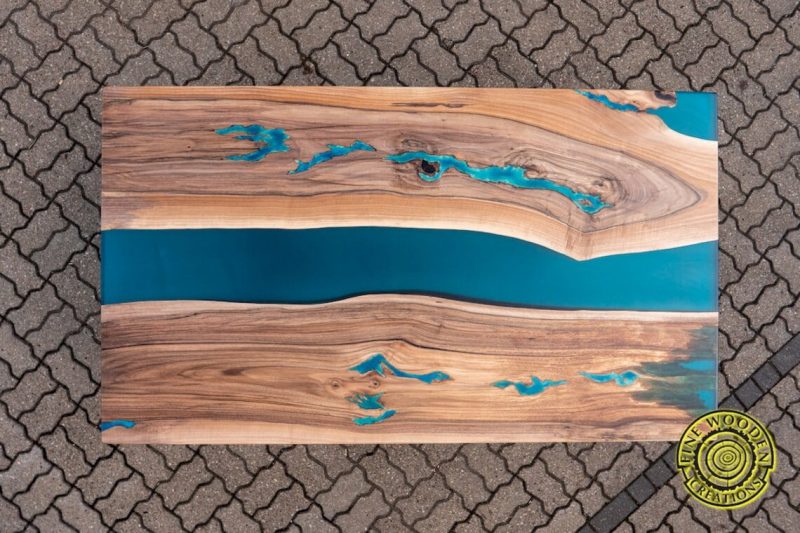 Jest to przykład nowoczesnego stołu jadalnianego w zestawie z ławą. Blat stołu powstał z połączenia turkusowej półprzezroczystej żywicy i dwóch kawałków drewna orzecha włoskiego. Naturalne pęknięcia i otwory w drewnie blatu stołu i ławy zostały wypełnione żywicą z domieszką turkusowego proszku luminescencyjnego, który świeci w ciemności subtelną turkusową barwą przez kilka godzin. Fantastyczny mebel, który sprawi, że Twoje wnętrza będą niepowtarzalne i zachwycające.