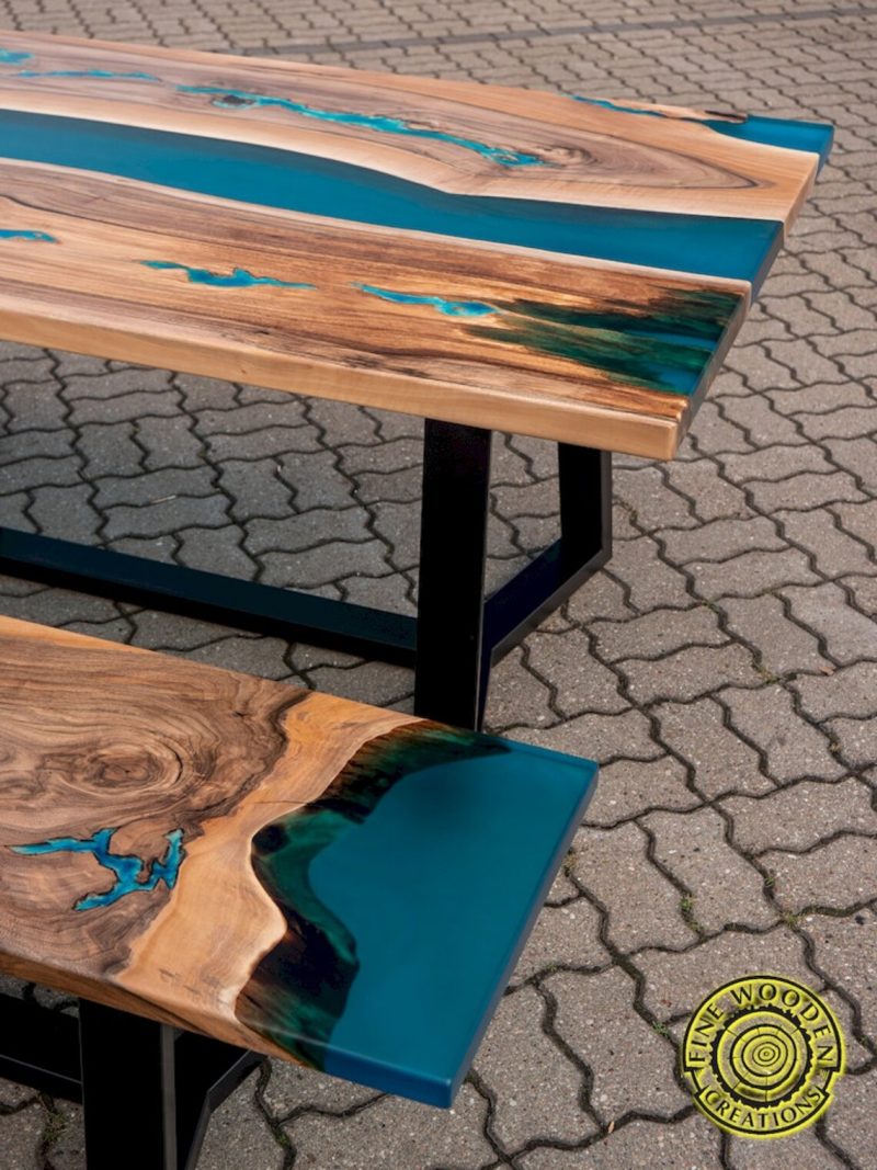 ...Stół do jadalni i dwie ławy z turkusową żywicą