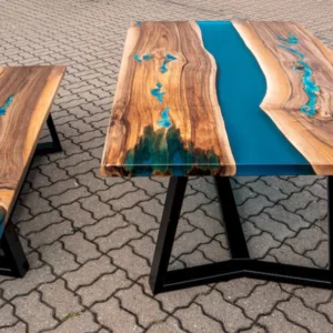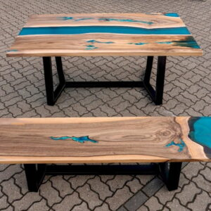 6 649.96 $Niezwykły zestaw do Twojej jadalni: stół i dwie ławy z drewna orzecha włoskiego i turkusowej półprzezroczystej żywicy.