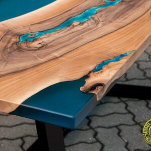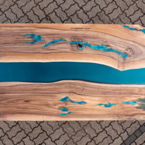 Jest to przykład nowoczesnego stołu jadalnianego w zestawie z ławą. Blat stołu powstał z połączenia turkusowej półprzezroczystej żywicy i dwóch kawałków drewna orzecha włoskiego. Naturalne pęknięcia i otwory w drewnie blatu stołu i ławy zostały wypełnione żywicą z domieszką turkusowego proszku luminescencyjnego, który świeci w ciemności subtelną turkusową barwą przez kilka godzin. Fantastyczny mebel, który sprawi, że Twoje wnętrza będą niepowtarzalne i zachwycające.