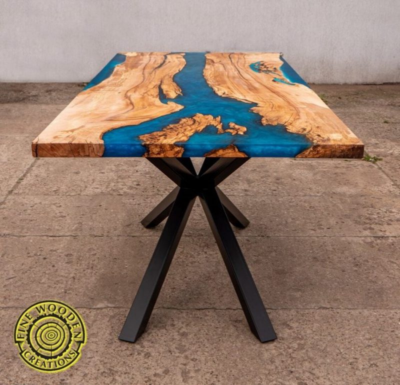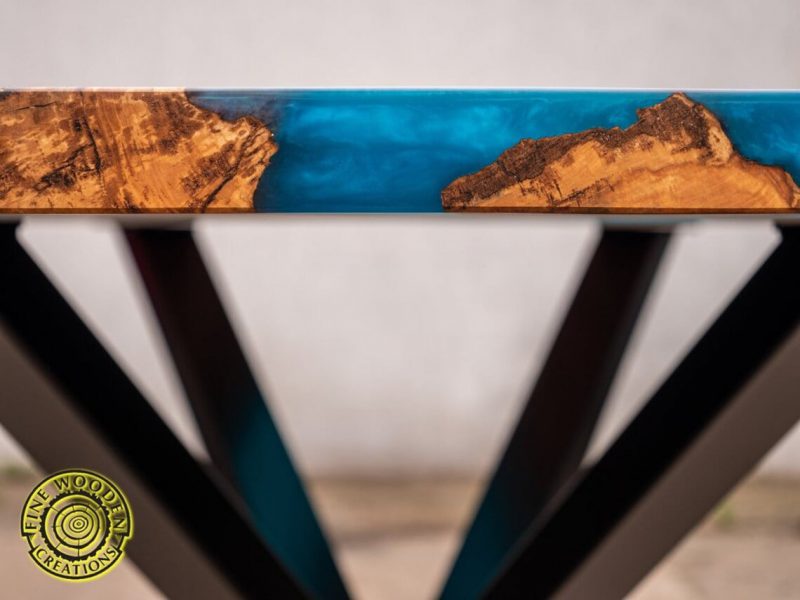 4 978.58 $Jest to przykład nowoczesnego stołu jadalnianego w zestawie z ławą. Blat stołu powstał z połączenia turkusowej półprzezroczystej żywicy i dwóch kawałków drewna orzecha włoskiego.