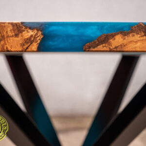 4 978.58 $Jest to przykład nowoczesnego stołu jadalnianego w zestawie z ławą. Blat stołu powstał z połączenia turkusowej półprzezroczystej żywicy i dwóch kawałków drewna orzecha włoskiego.