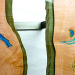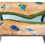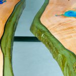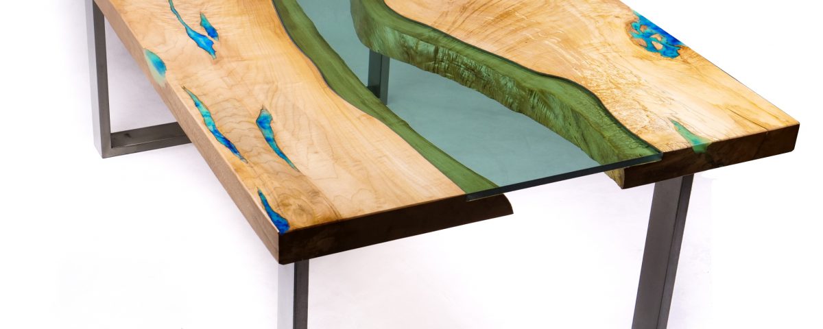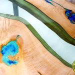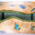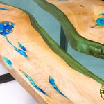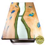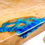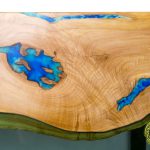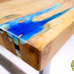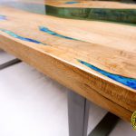 Bright ash wood makes the table contrasting with glowing resin filling.