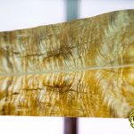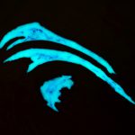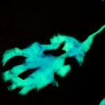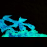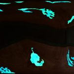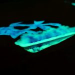 Cracks, knots and holes are filled with glowing in the dark turquoise and green pigment