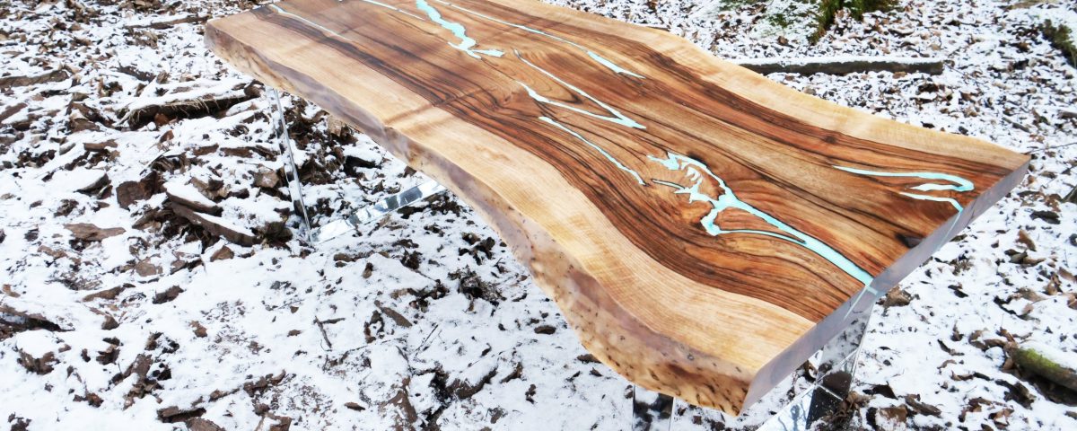 Table top made of one solid piece of walnut wood with many cracks and holes. Turquoise, bright glowing luminescence pigment fills he cracks. Turquoise glowing pigment shines in the evening showing all the filled cracks.