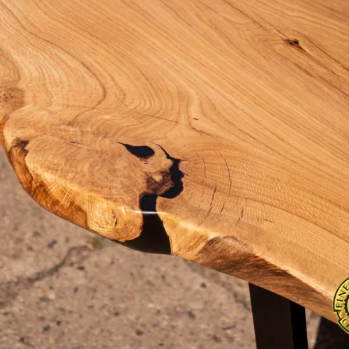 Live edge oak coffee table with black resin , black powder painted legs, rustical oak