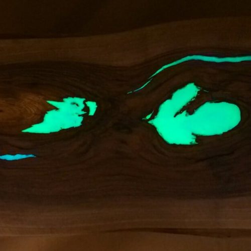 “Thunderstorm” walnut wood Bed side end resin table with glowing resin, industrial style legs