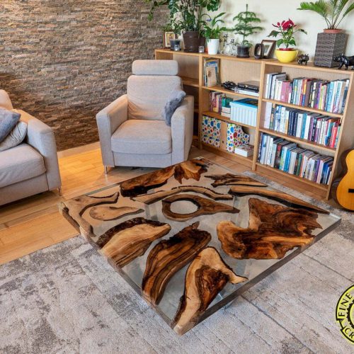 3 627.25 $Square resin and walnut coffee table. Pieces of walnut wood embedded in transparent crystal clear...