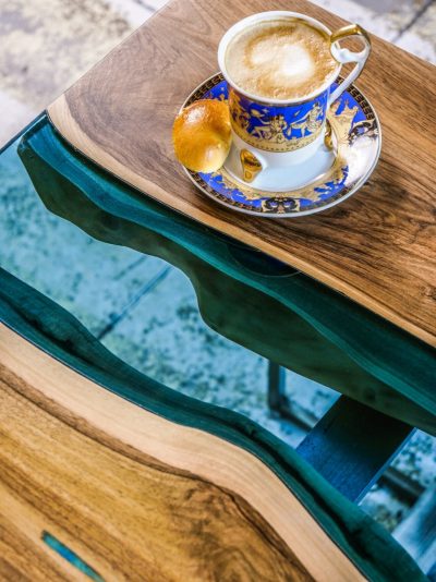 -Table top made of walnut; resin and wood are 4,5 cm thick, blue transparent glass is 1 cm