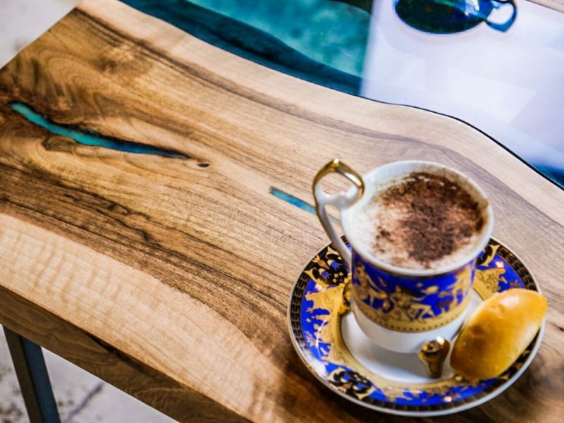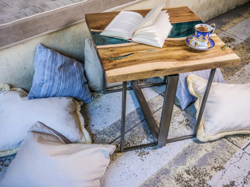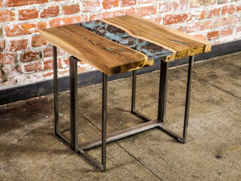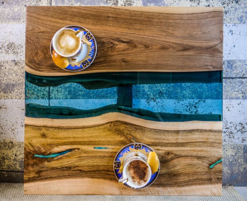 Charming square walnut table with glass river and glowing resin. This table can be used as typical coffee table , bedside table or end table. In this example there are some special resin fill in areas which are also mixed with luminescence turquoise powder. This mix is glowing in the dark – subtle evening turquoise color is shining for several hours. Legs are made of brushed steel covered with transparent lacquer.