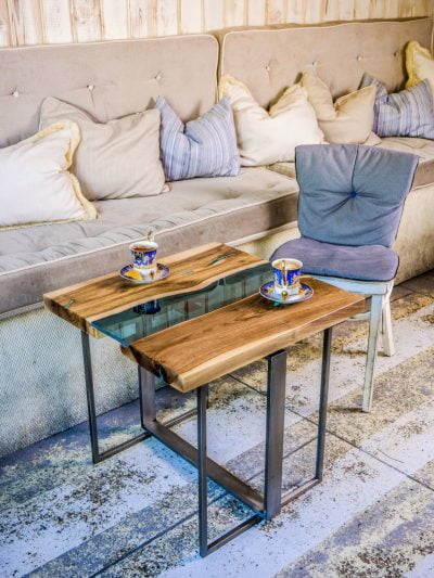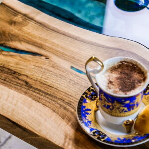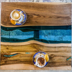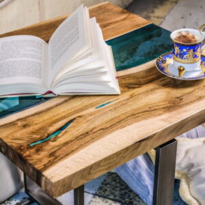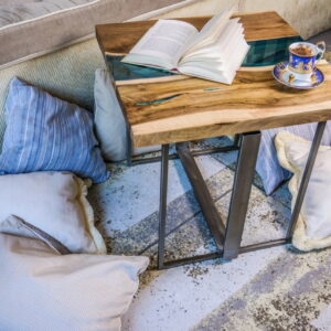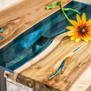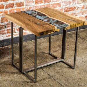 Charming square walnut table with glass river and glowing resin. This table can be used as typical coffee table , bedside table or end table. In this example there are some special resin fill in areas which are also mixed with luminescence turquoise powder. This mix is glowing in the dark – subtle evening turquoise color is shining for several hours. Legs are made of brushed steel covered with transparent lacquer.