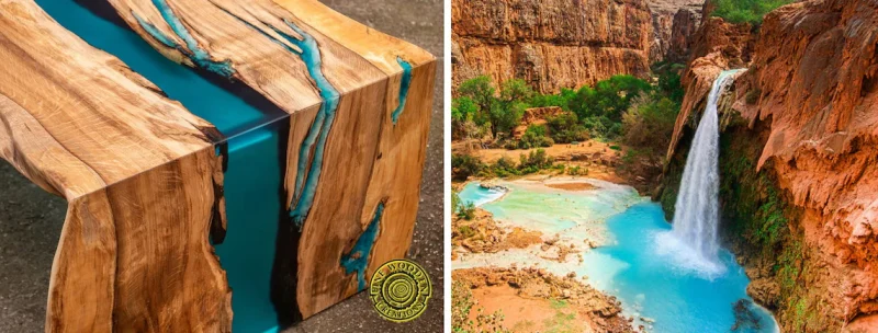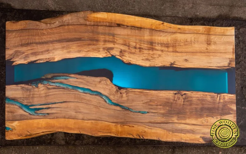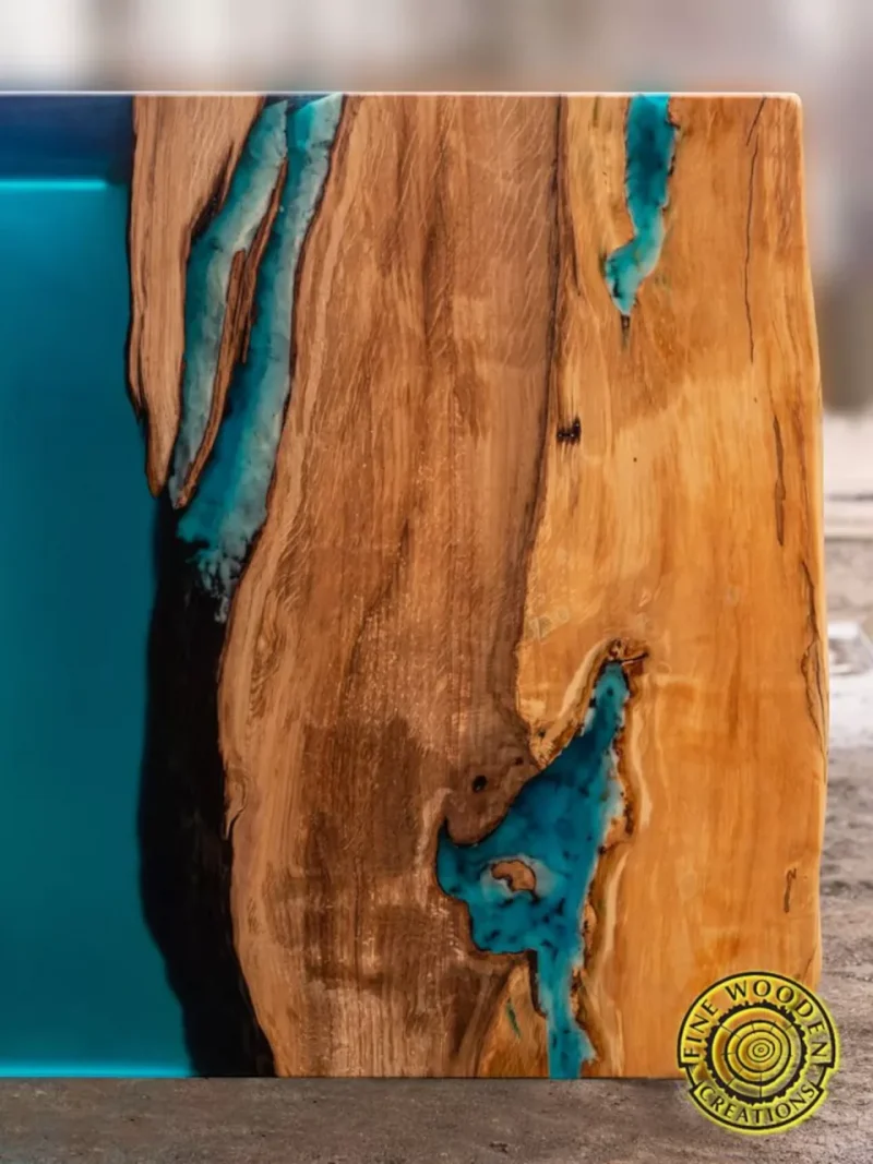 River flows through tale top and then turns to the legs going down. It has a turquoise + emerald resin ‘river’ flowing between wood pieces.