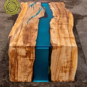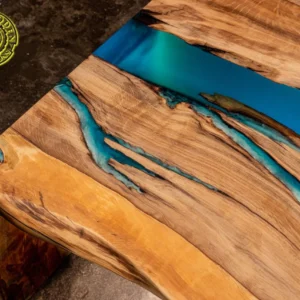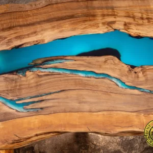River flows through tale top and then turns to the legs going down. It has a turquoise + emerald resin ‘river’ flowing between wood pieces.