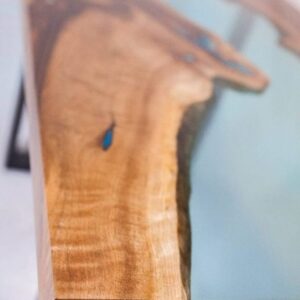 ...WOLIN – turquoise eye – glass river coffee table with glowing resin fillin and wooden legs