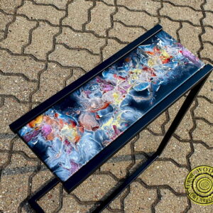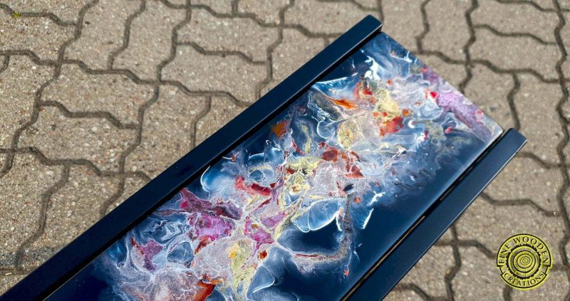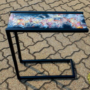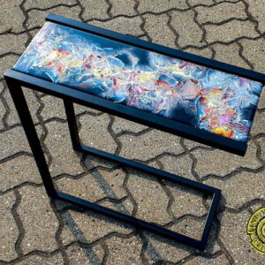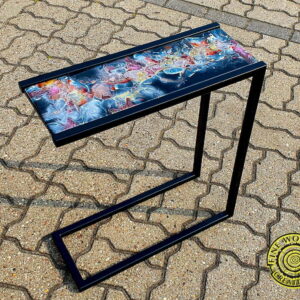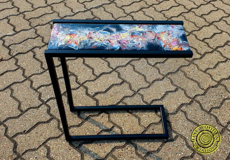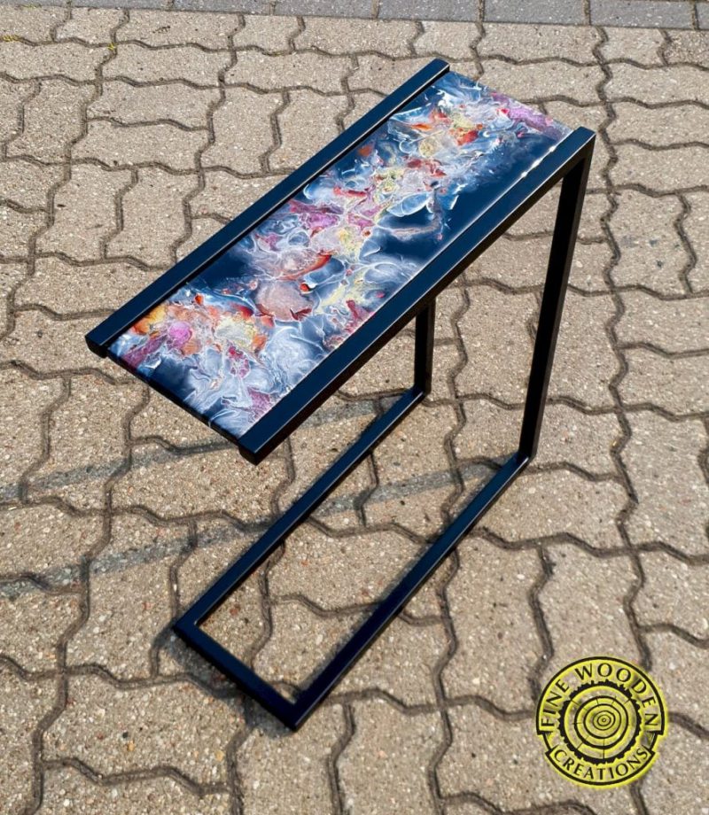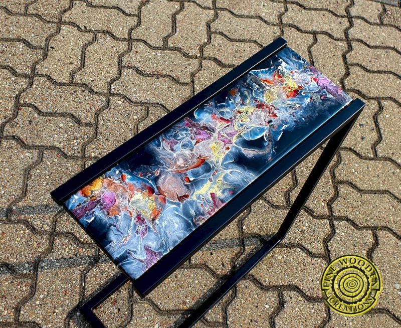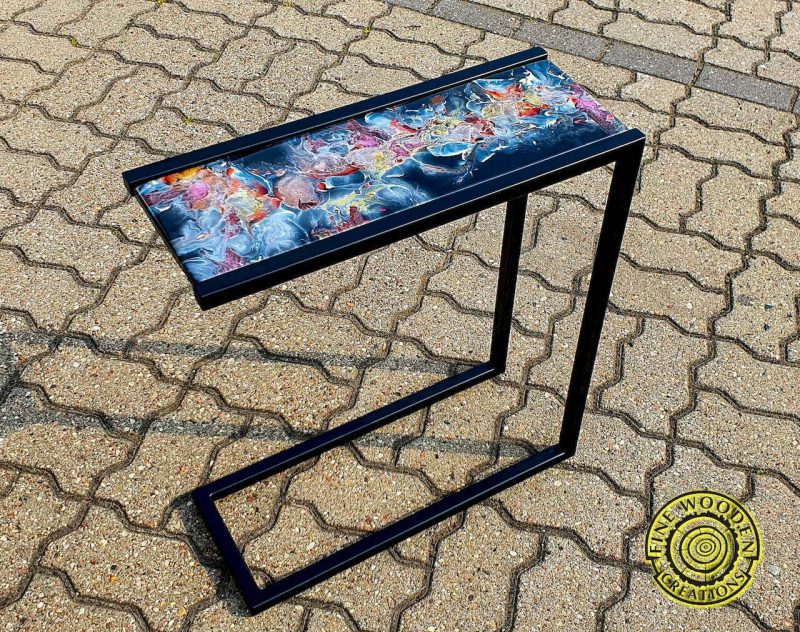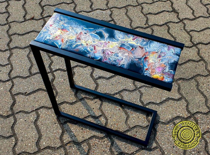 Multipurpose bedside resin table, end table with an industrial style base frame – powder coated, black 2cm profile. Pour painted surface with abstract design and pattern. Can be made with any color palette eg few selected colors.
