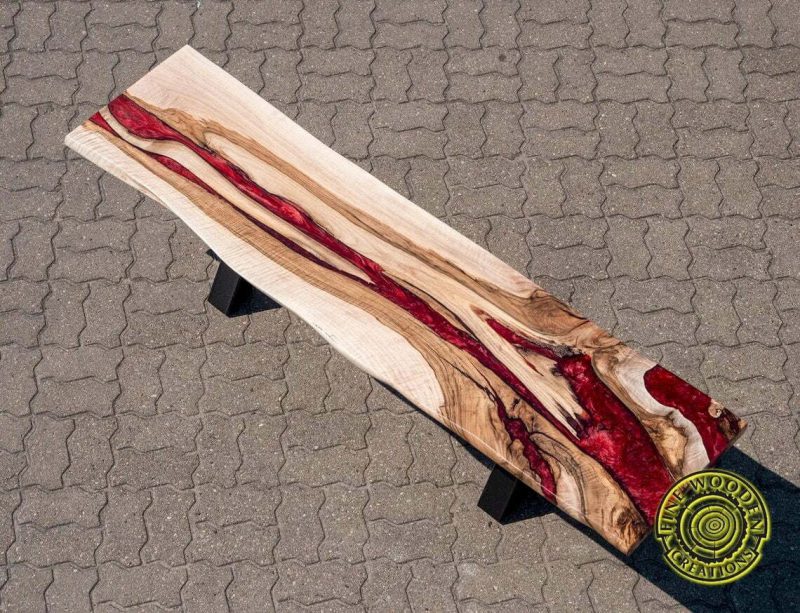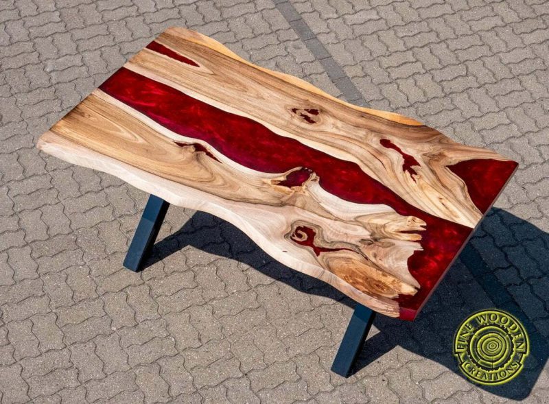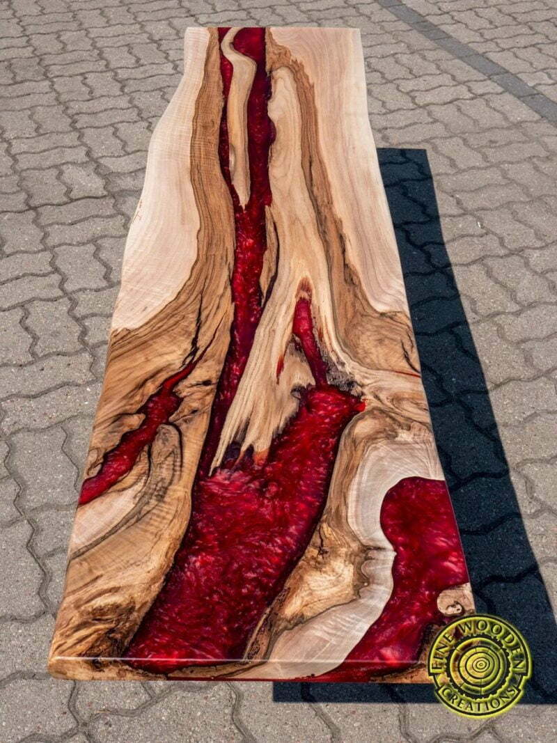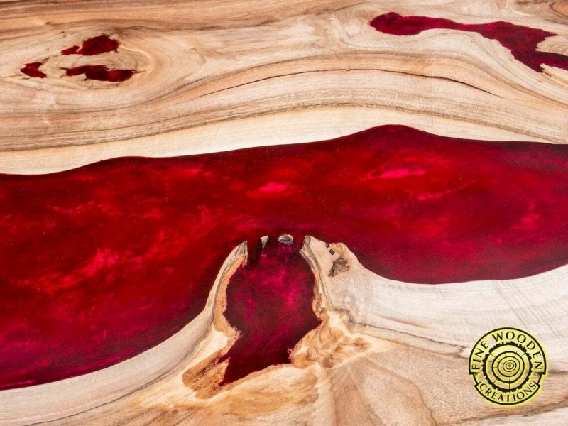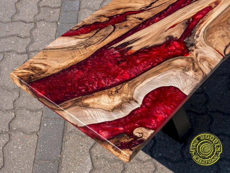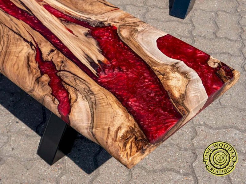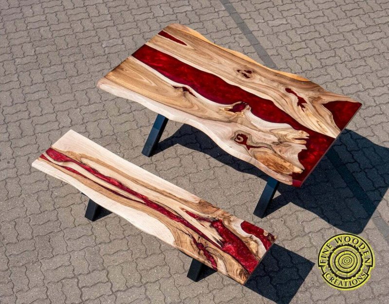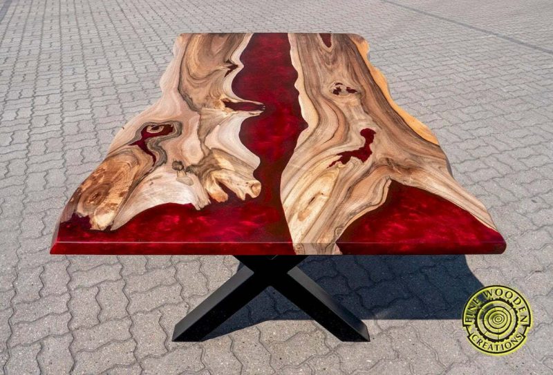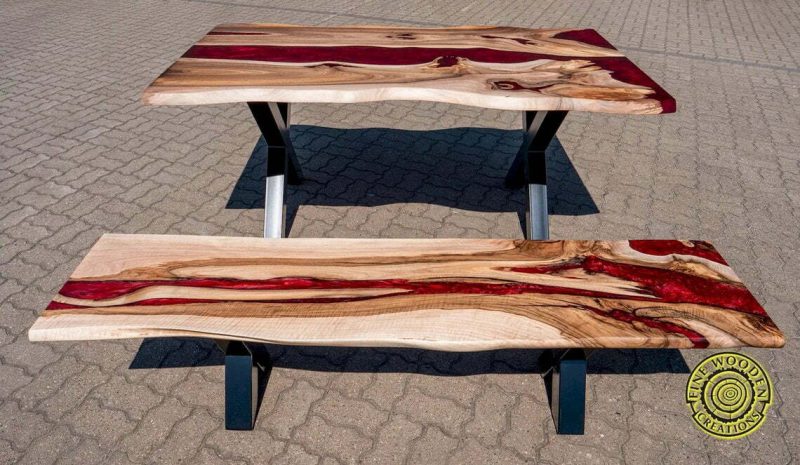 Extraordinary, epoxy resin dinning set with river dining table with bench, red pearl resin in modern style with X farm style legs.