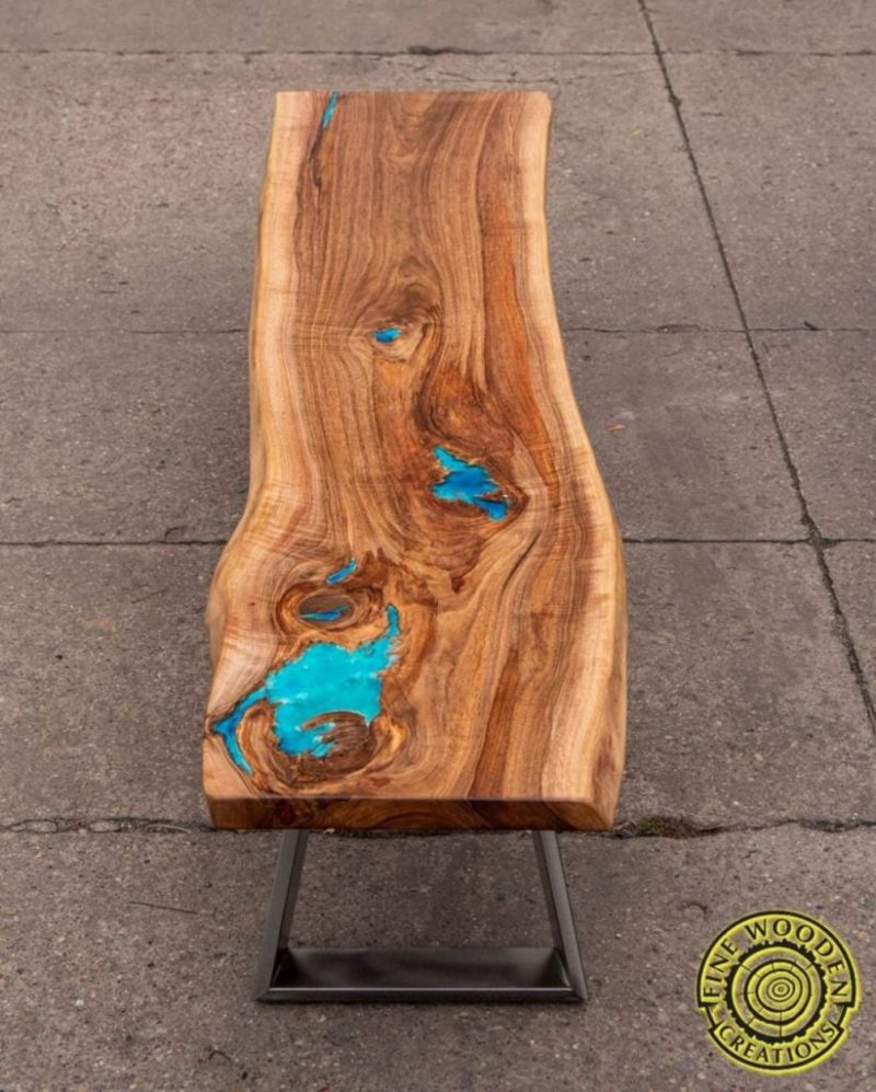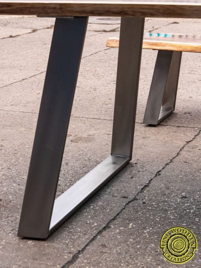 Live edge river glass dining table with bench and glowing resin fill in, steel legs
