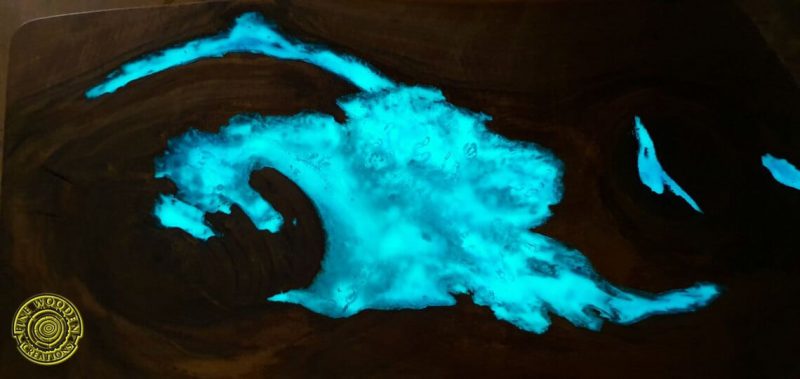 – Cracks, knots and holes are filled with glowing in the dark turquoise and green pigment