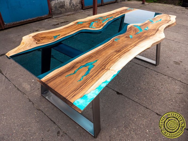 3 439.83 $This is example of modern live edge river dining table with bench with glowing turquoise pigment and resin. Table top contains 1 cm thick river blue transparent glass. Turquoise glowing pigment shines for 10 hours after it gets some light – best few minutes of sunlight or strong bulb light.