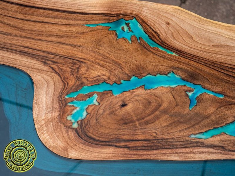 ...Live edge 3D effect river dining table with turquoise glowing resin, walnut wood