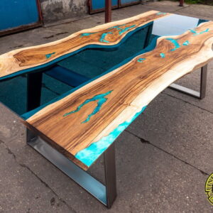 3 439.83 $This is example of modern live edge river dining table with bench with glowing turquoise pigment and resin. Table top contains 1 cm thick river blue transparent glass. Turquoise glowing pigment shines for 10 hours after it gets some light – best few minutes of sunlight or strong bulb light.