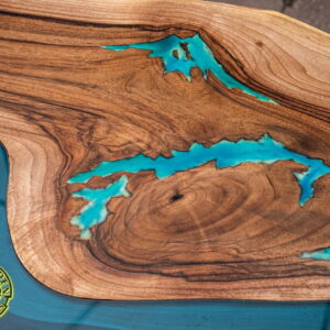 2 232.94 $One of a kind live edge 3D effect river dining table with turquoise glowing resin. Table with glass river – semi transparent. Glass is 1 cm thick. Turquoise glowing pigment shines for 10 hours after it gets some light – best few minutes of sunlight or strong bulb light.