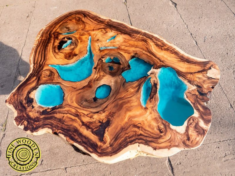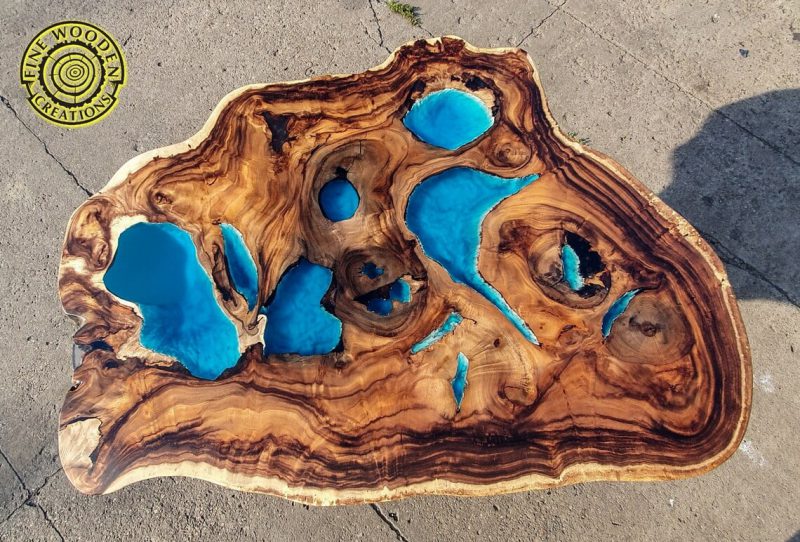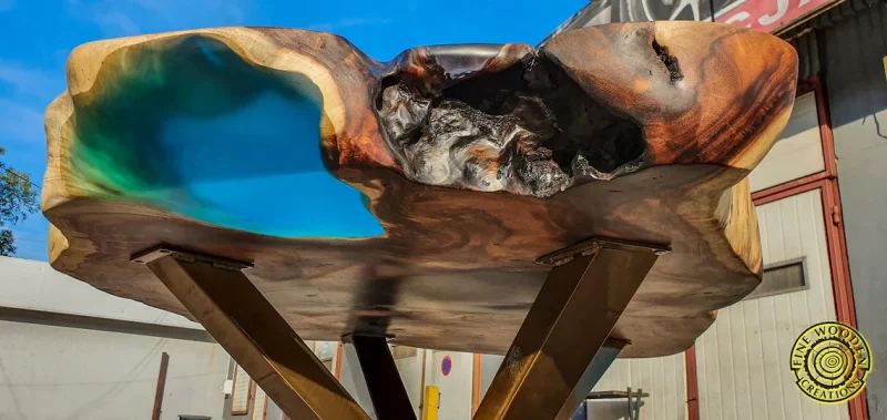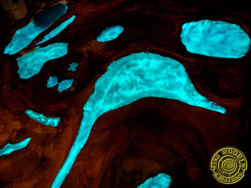 In this example there are some special resin fill in areas which are also mixed with luminescence turquoise powder. This mix is glowing in the dark – subtle evening turquoise color is shining for about 10 hours. Legs are made of stainless steel and polished to mirror