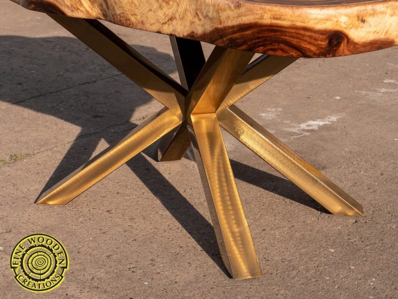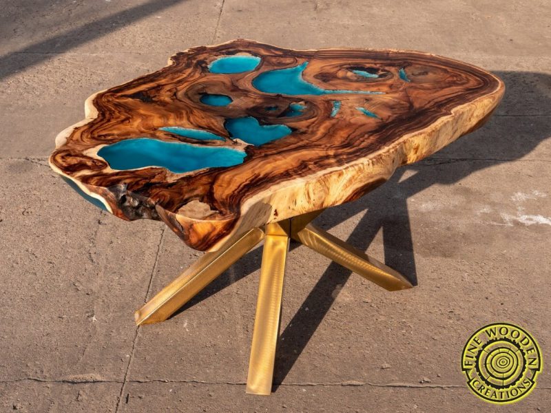 Very unique suar round Live Edge dining Table with glowing turquoise pigment and resin with golden legs in X style. It has a natural cracks filled with turquoise resin