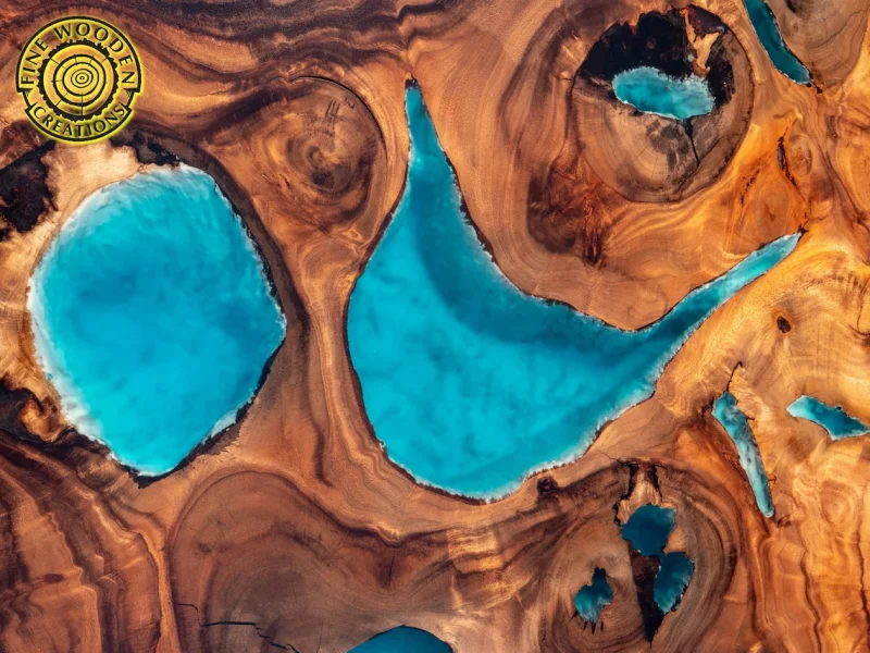 Live edge resin river dining table with turquoise glowing resin / elm wood