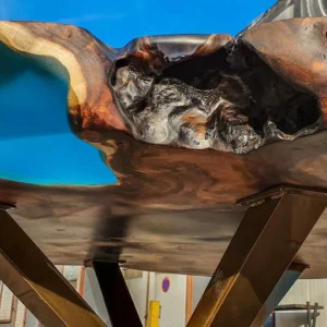 In this example there are some special resin fill in areas which are also mixed with luminescence turquoise powder. This mix is glowing in the dark – subtle evening turquoise color is shining for about 10 hours. Legs are made of stainless steel and polished to mirror