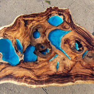 Live edge resin river dining table with turquoise glowing resin / elm wood