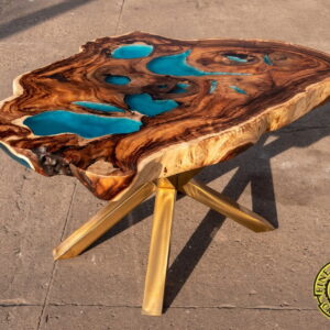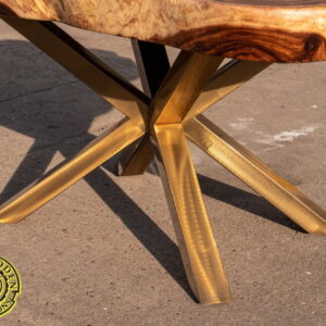 Very unique suar round Live Edge dining Table with glowing turquoise pigment and resin with golden legs in X style. It has a natural cracks filled with turquoise resin