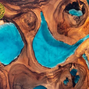 Modern walnut live edge river dining table with glowing turquoise pigment and resin.