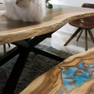 6 207.38 złThis dining live edge table is made of two slabs with small addition of glowing resin. Strong legs base and thick table top make it a stable table for all the family anniversaries.