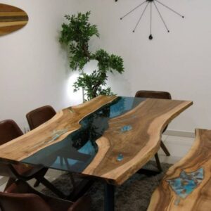 ...This is example of modern live edge river dining table with bench with glowing turquoise pigment and resin. Table top contains 1 cm thick river blue transparent glass. Turquoise glowing pigment shines for 10 hours after it gets some light – best few minutes of sunlight or strong bulb light.