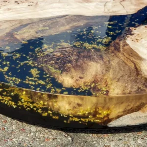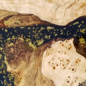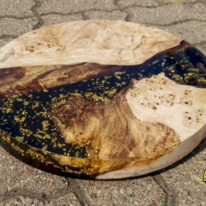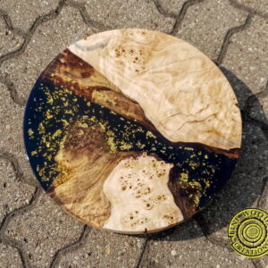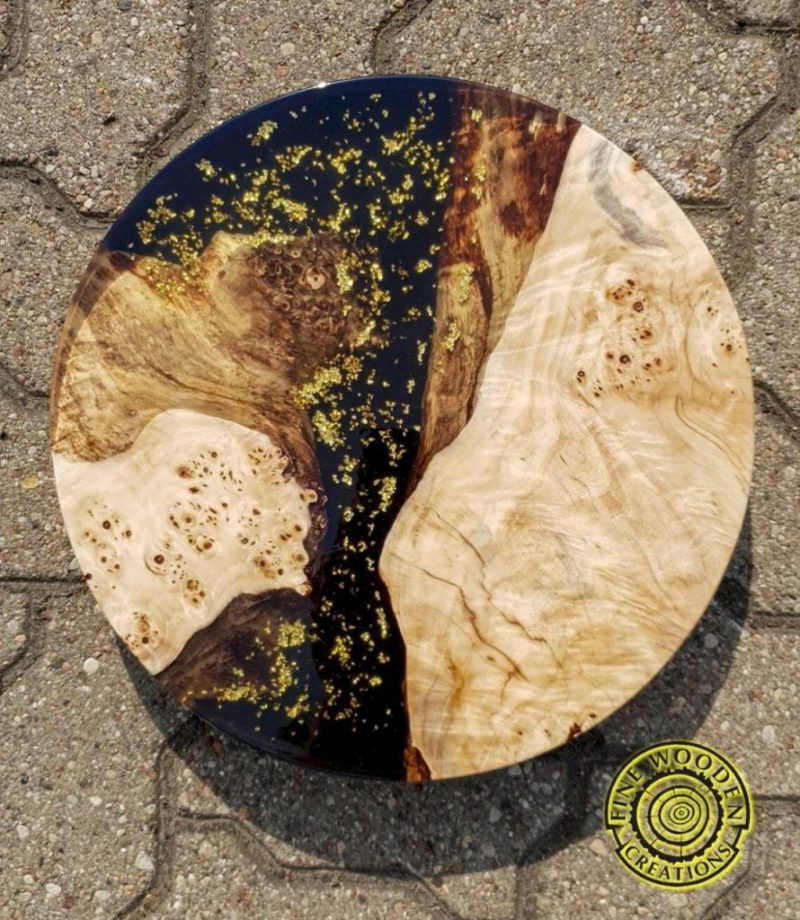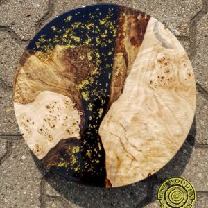Extraordinary burlwood serving board with gold flakes on black resin – gives your family meeting new fresh feel!
