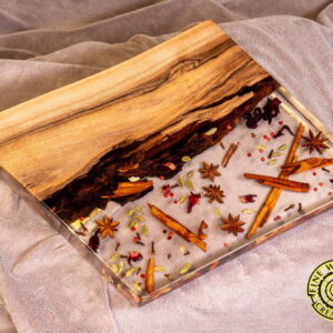 ...Unique serving board with cinnamon, pepper, anise, cloves, cardamom preserved in crystal clear epoxy resin. Brings unrepeatable ambience to any occasion.