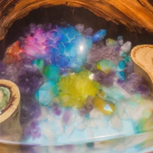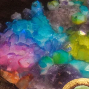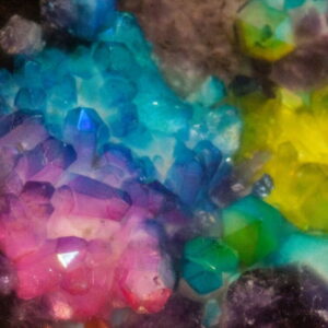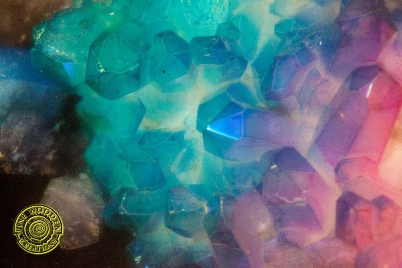 Rainbow amethysts are subjected to undergoing reaction with metals. Then they change their colors. Finished with food-safe varnish. Steel legs with transparent lacquer.