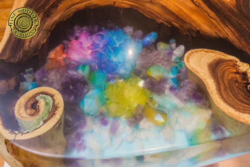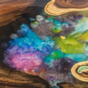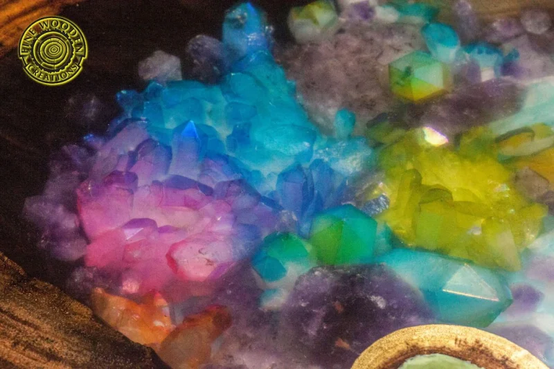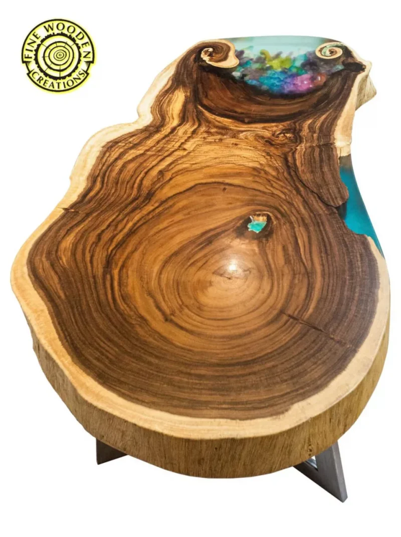 Hand-crafted coffee table made of exotic wood /suar/ with turquoise epoxy resin / glowing powder and with real amethysts and rainbow amethysts.