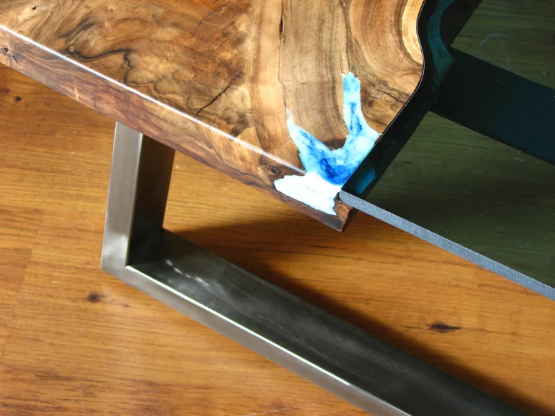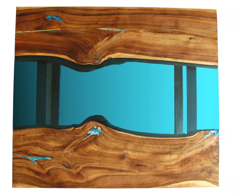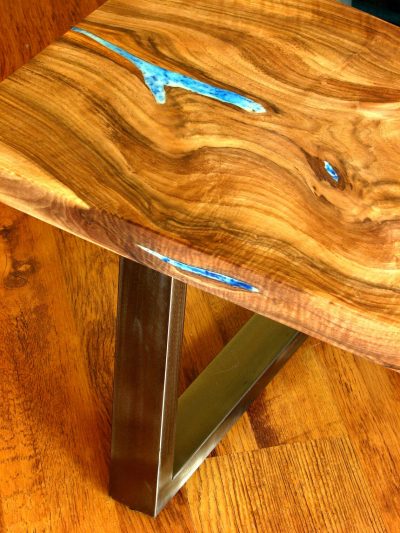 Square epoxy resine River Coffee Table with brushed legs and glowing resin. It’s glass ‘river’ flowing between walnut wood pieces carefully selected to create natural river flow so no other copy. It adds style and elegance to your interiors.